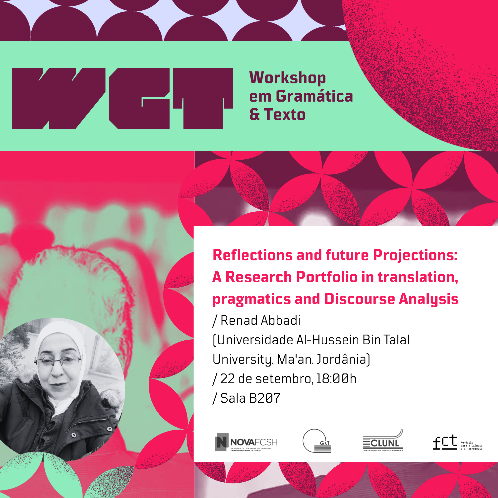 The Grammar & Text research group of CLUNL is pleased to invite you to another “Grammar & Text Workshop”, featuring a lecture by Renad Abbadi, who will speak on “Reflections and future projections: a research portfolio in translation, pragmatics and discourse analysis”.